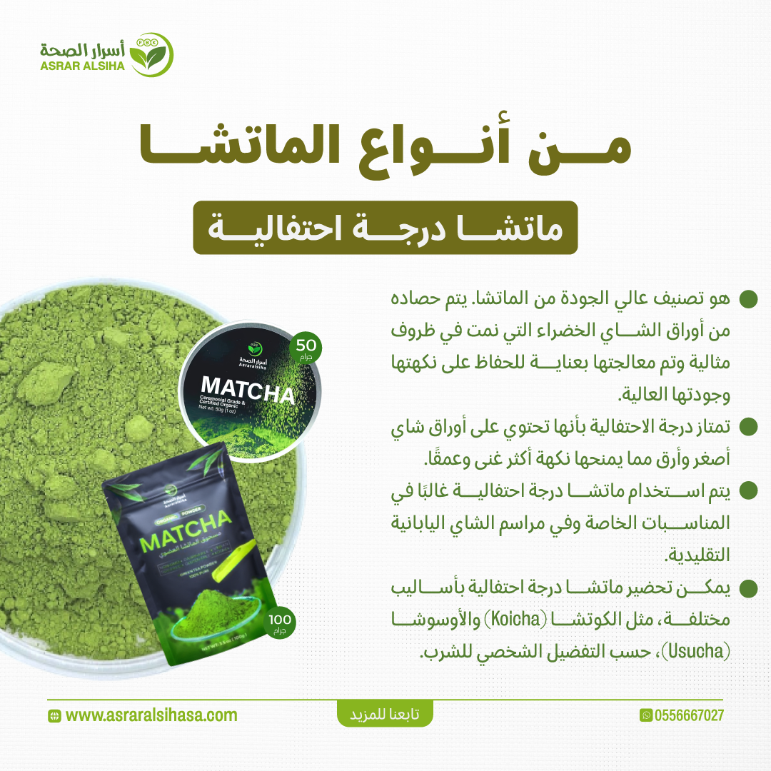 هناك أنواع مختلفة من الماتشا، حسب مستوى الجودة وكيفية تحضيره. الأنواع الرئيسية تشمل:
